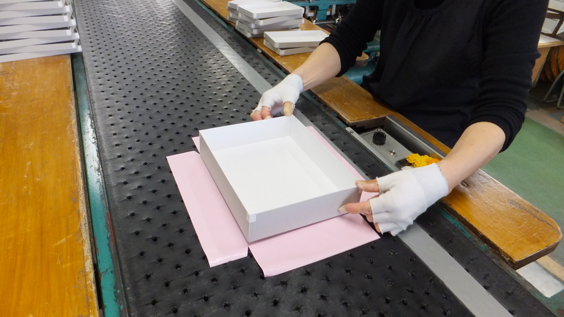 貼箱とは、生地となる厚紙(チップボール等)に、紙を張って作る紙器の事です。